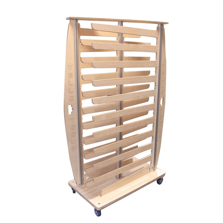 Den mobile filmrullholderen Speed TimberRack, laget av høykvalitets tre, gir plass til totalt 42 ruller.