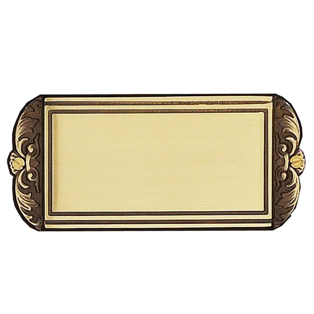 Rektangulært dørskilt i børstet messing. Har en oksidert dekorativ kant. Størrelse 150x70 mm.