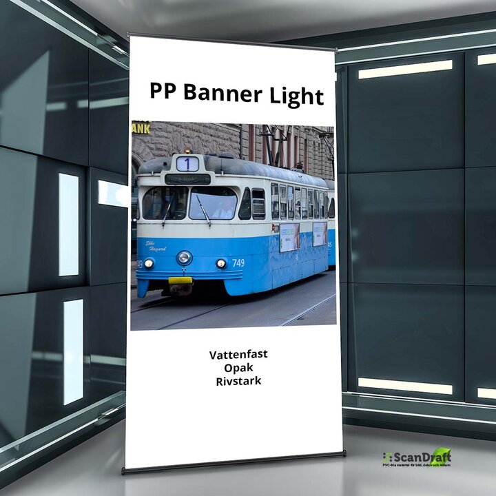 En matt hvit film av polypropylen som gir rivesterke, ripebestandige utskrifter. Et svært anvendbart materiale som egner seg til portable displaysystemer, roterende skiltsystemer eller til hengende bannere og banderoler. Kan utstyres med hullringer.